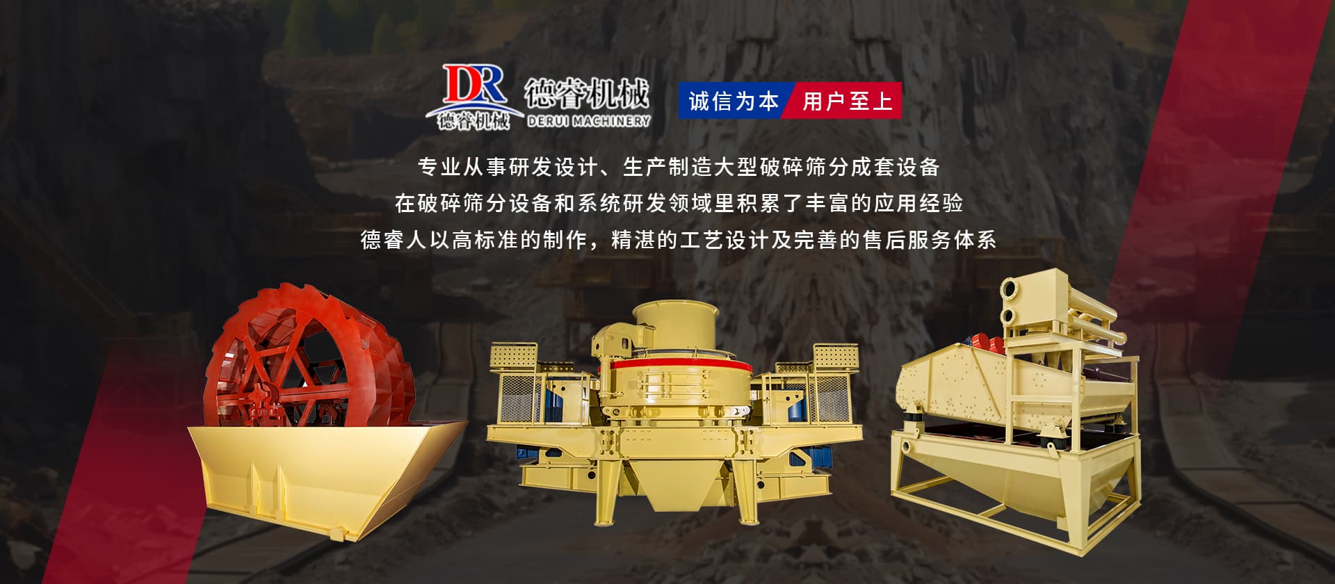 德睿重型機械是從事研發(fā)設計、生產(chǎn)制造大型破碎篩分成套設備的現(xiàn)代高新技術企業(yè)集團,公司總部座落于廣東工業(yè)重鎮(zhèn)、韶關市湞江區(qū)工業(yè)園,有現(xiàn)代化辦工場地、研發(fā)中心和標準化廠房,多種大型機械加工設備10余套,現(xiàn)公司技術人員40余名。 公司在主要城市均設有辦事處,配有豐富實戰(zhàn)經(jīng)驗的設計工程師,方便為各地客戶現(xiàn)場分析、配置生產(chǎn)線并提供及時、周到的售后服務。 目前產(chǎn)品已覆蓋東南亞、中東、非州、歐州等多個國家和地區(qū),并獲得客戶的好評。公司已成為主要的專業(yè)礦山設備,工業(yè)磨粉、碎石制砂設備的生產(chǎn)和出口基地之一。 “誠信為本,用戶至上”德睿人以高標準的制作,精湛的工藝設計及完善的售后服務體系在破碎篩分設備和系統(tǒng)研發(fā)領域里積累了豐富的應用經(jīng)驗。借助在破碎行業(yè)的豐富經(jīng)驗,公司可向客戶提供碎石制砂生產(chǎn)線設計、安裝、調(diào)試等交鑰匙工程,同時承接破碎系統(tǒng)的爆破、裝運、破碎等生產(chǎn)運行總承包。